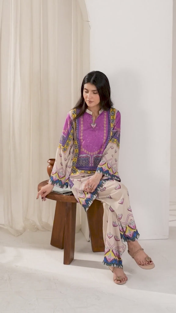 This two-piece outfit beautifully blends tradition with a modern touch. The kurta features a rich purple base adorned with intricate geometric and ornamental motifs in shades of blue, yellow, and pink. The neckline has a classic slit design finished with a white border for a refined contrast. Full sleeves are enhanced with statement prints, complementing the hemline’s detailed borders.