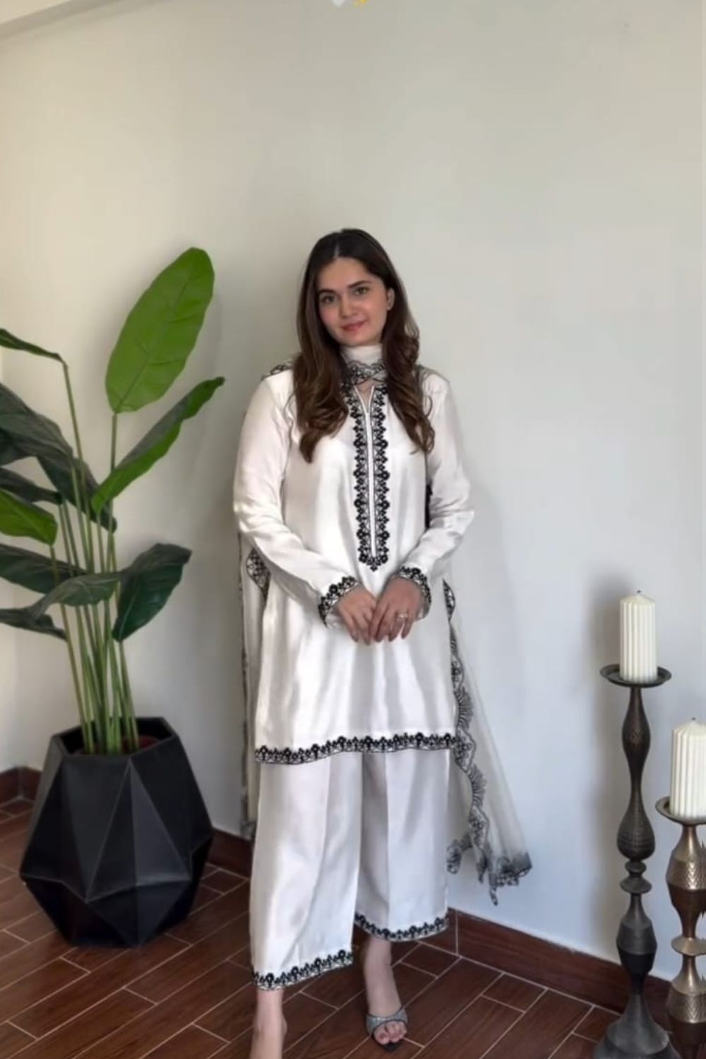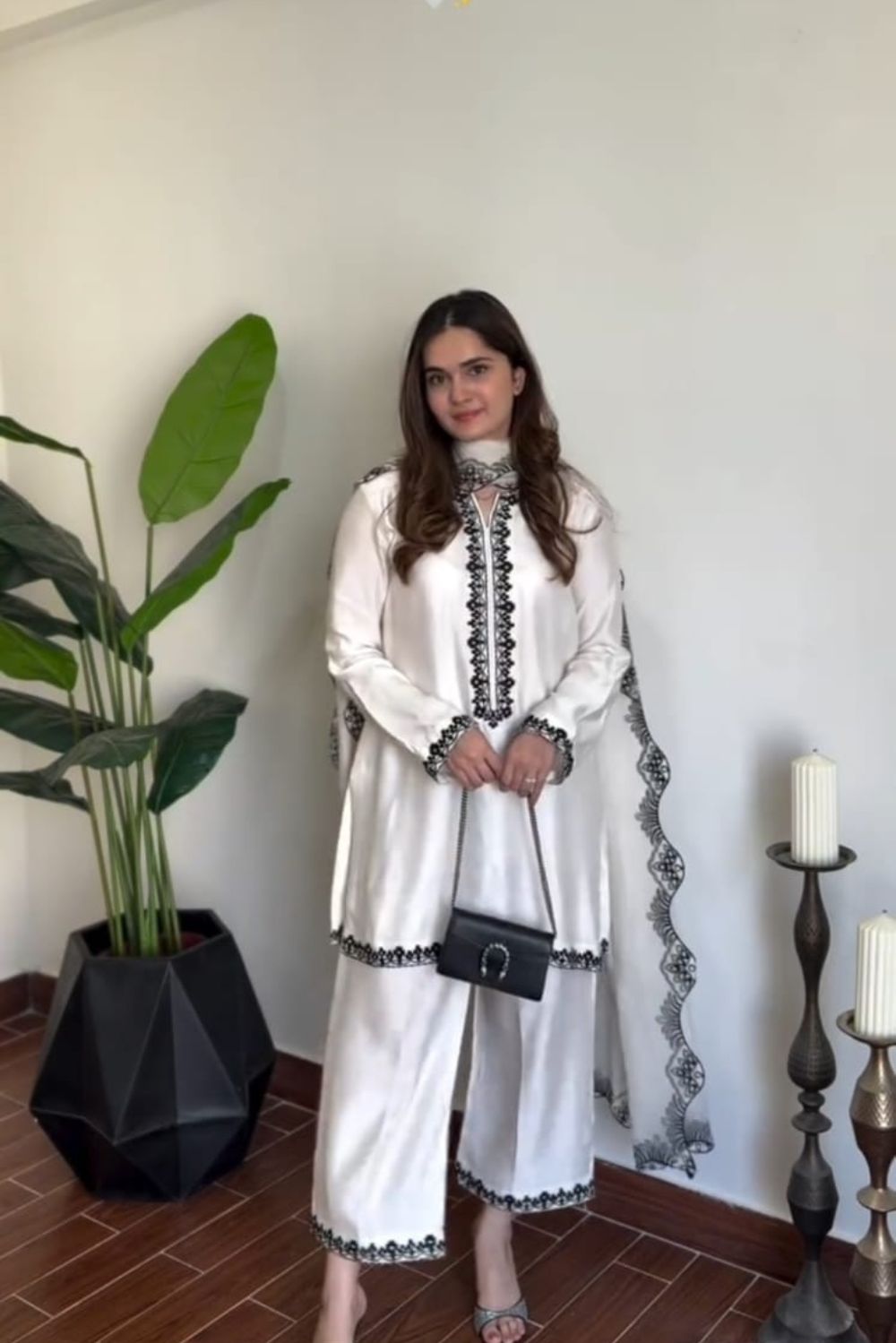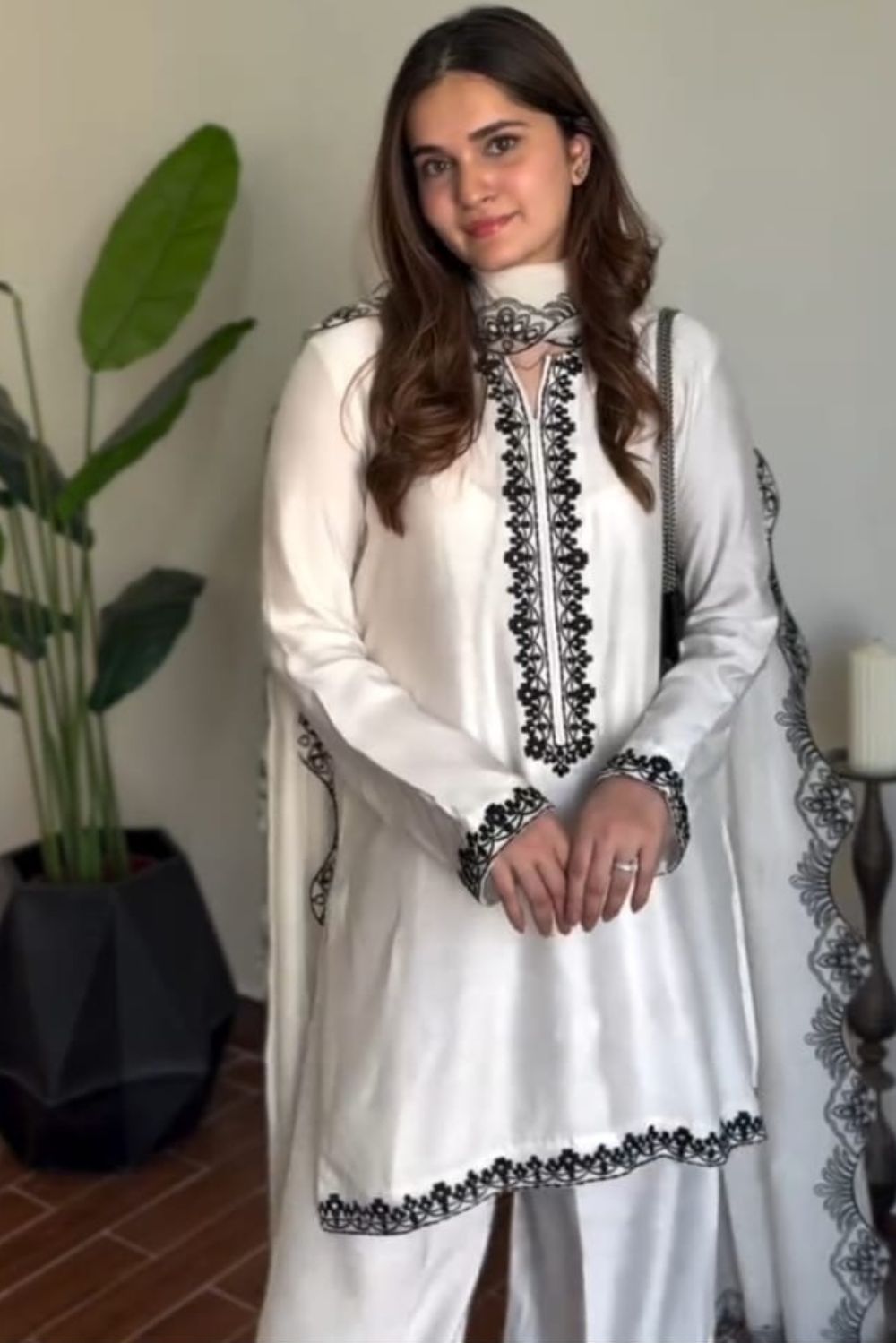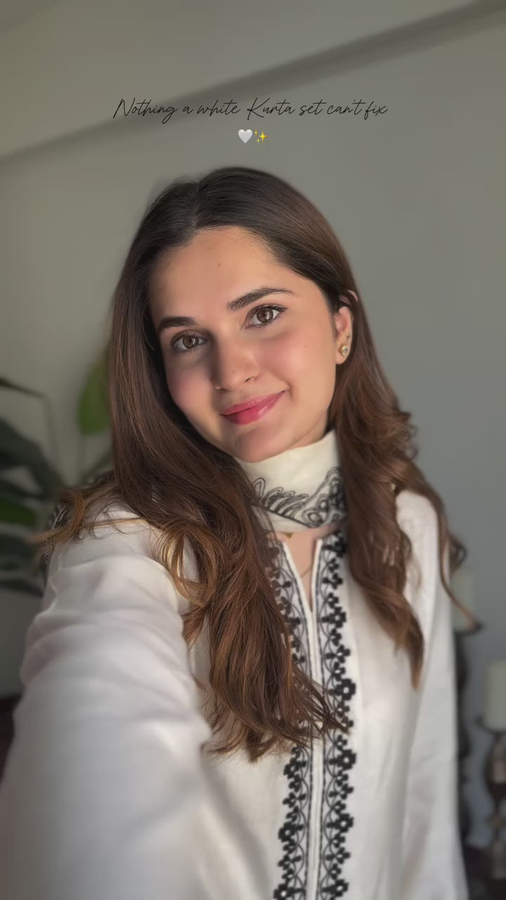 The outfit is delicately finished with black embroidered detailing on the neckline, sleeves, and borders—making it a statement piece for both formal and semi-formal occasions.