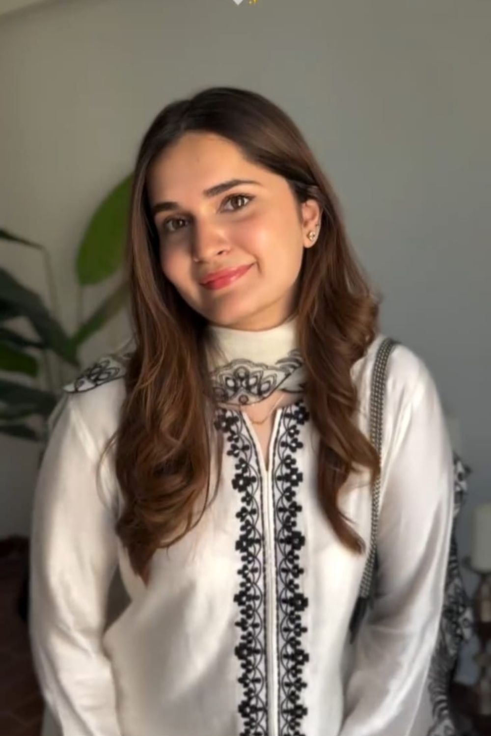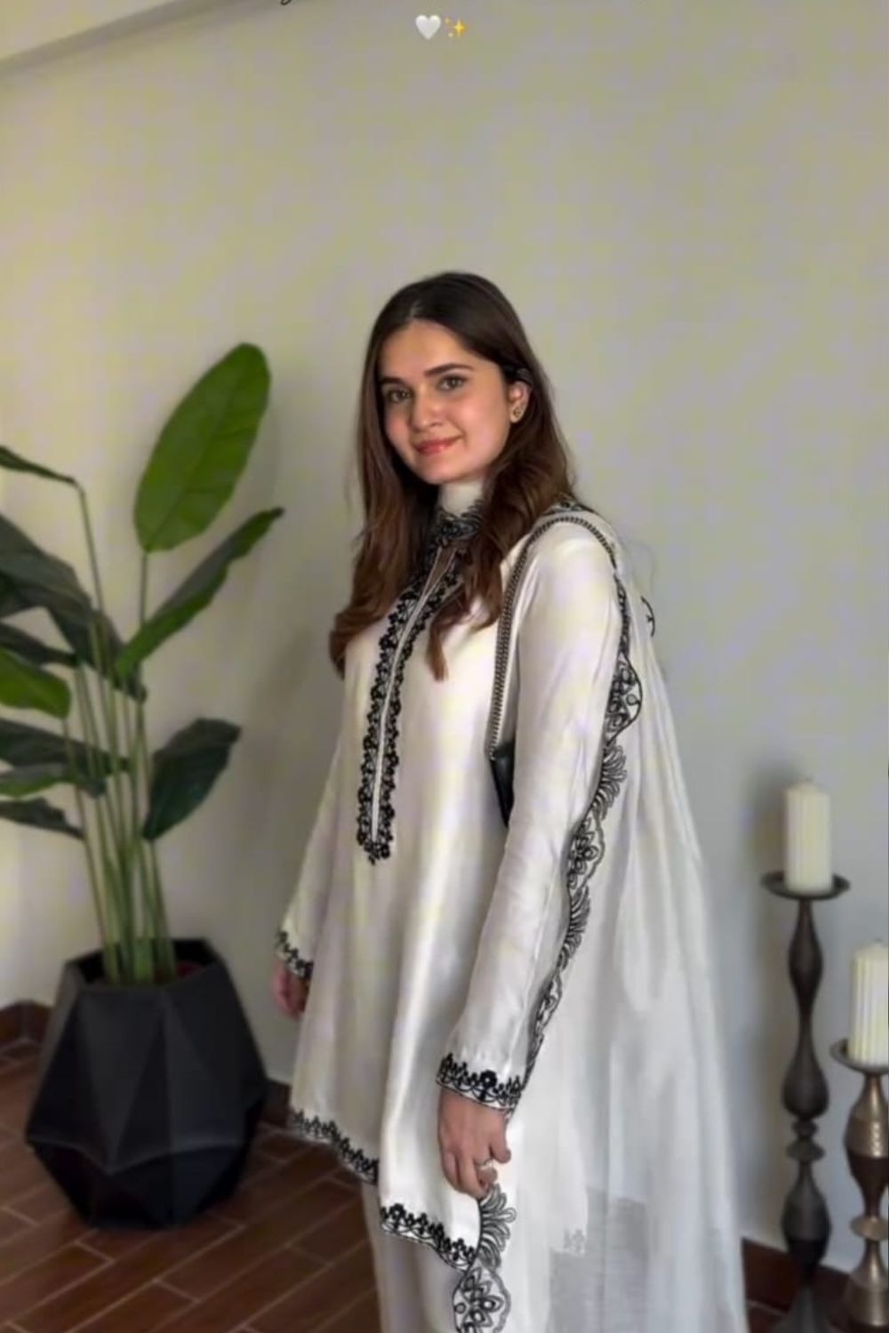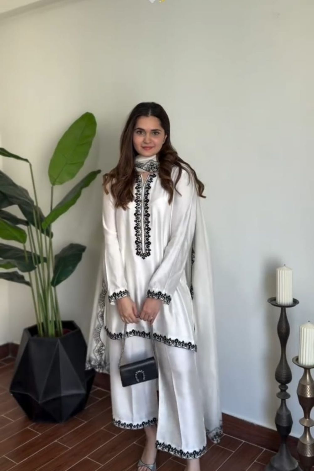 The outfit is delicately finished with black embroidered detailing on the neckline, sleeves, and borders—making it a statement piece for both formal and semi-formal occasions.
